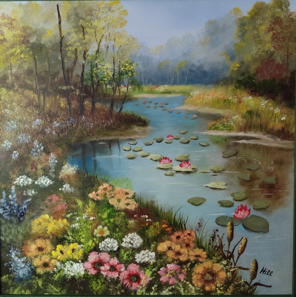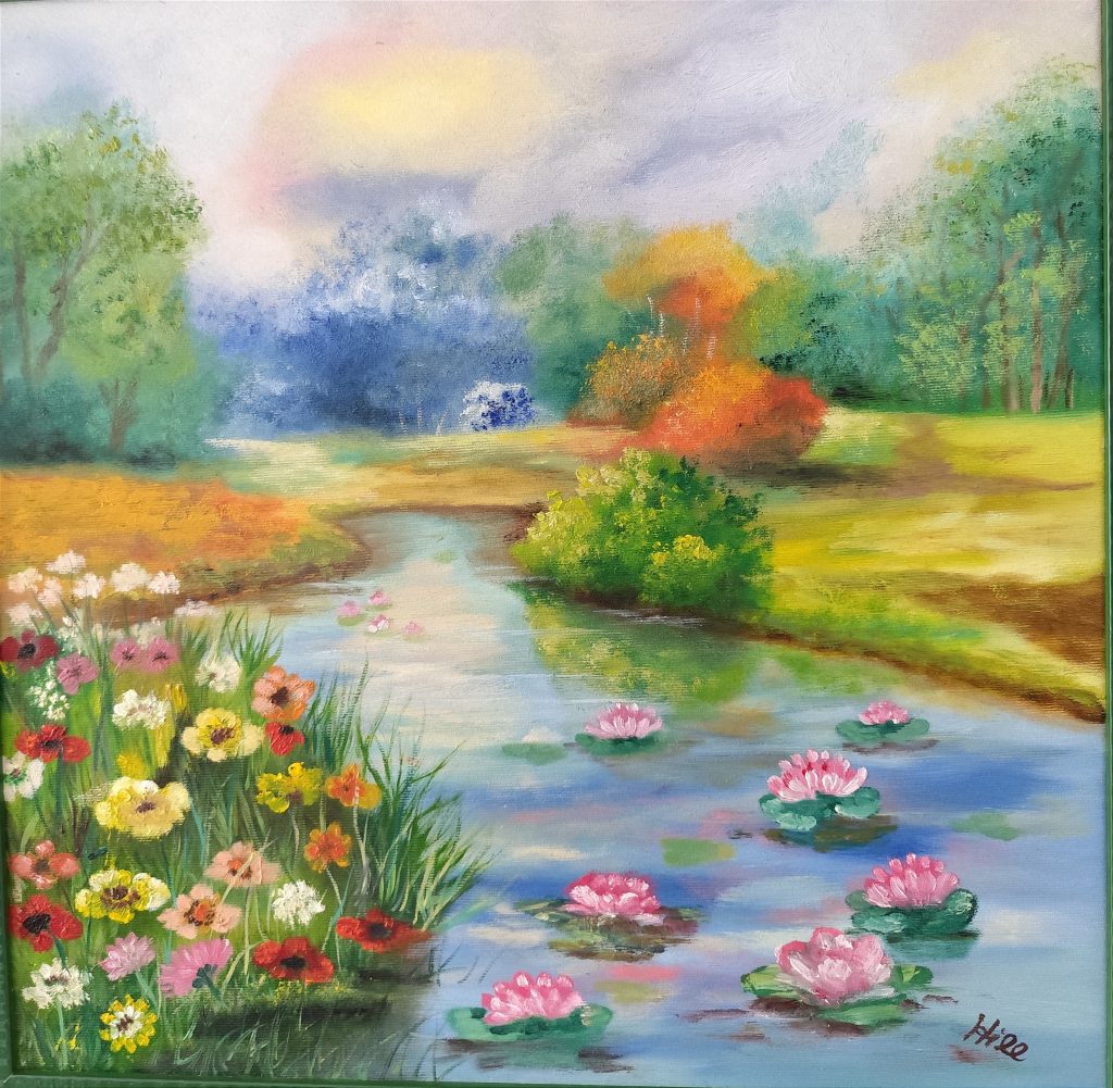 Bach mit Seerosen und Blumenwiese – Öl auf Leinwand 2024